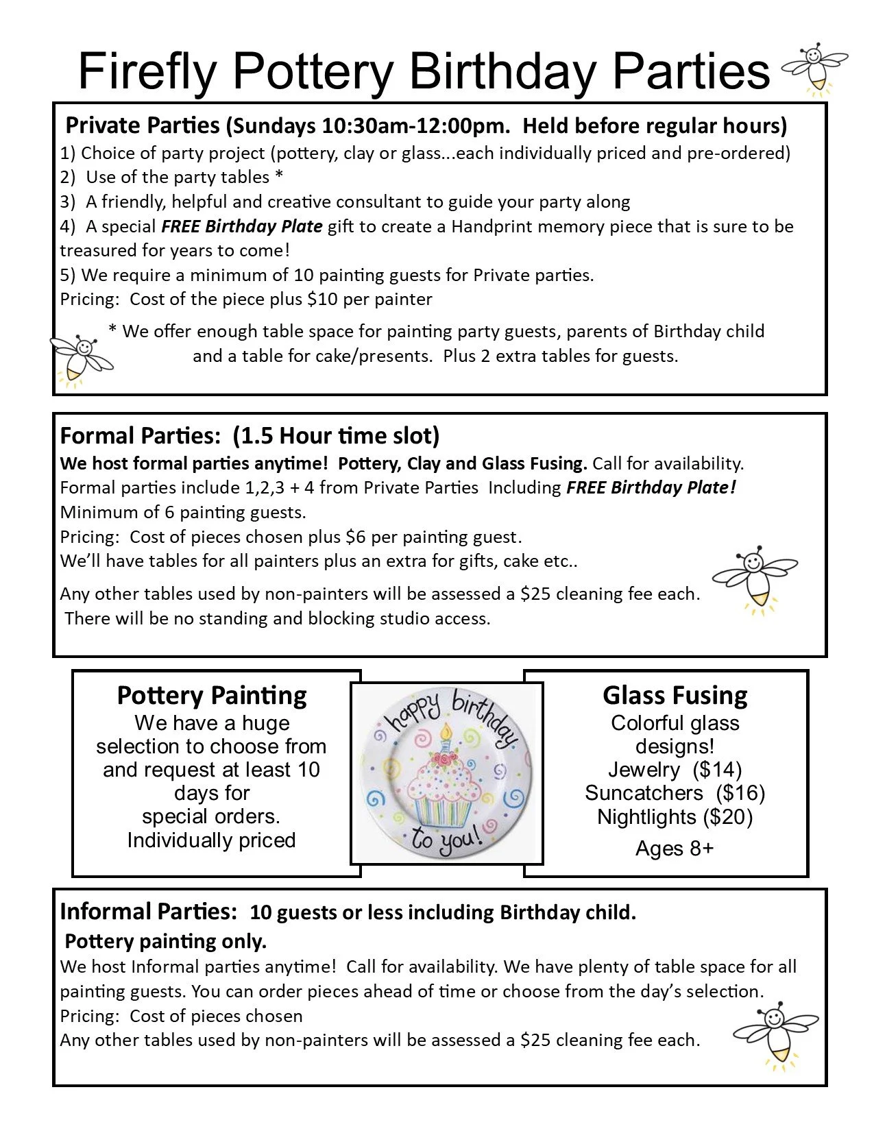 Birthday Party paint kits are a refundable $20 on top of the pottery cost for Birthday Parties